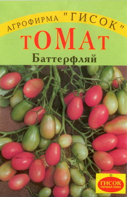 ТОМАТ БАТТЕРФЛЯЙ Среднеранний сорт универсального назначения. Растение высотой до 1,5 м с красивыми разветвленными соцветиями, 20-50-ю торчащими вверх гладкими малиново-розовыми плодами яйцевидной формы, массой 25-30 г. Урожайность 4-5 кг/растение. Выращивать в один стебель с пасынкованием и подвязкой к опоре. Рекомендуется для теплиц и укрытий, с успехом может выращиваться на балконах и лоджиях.